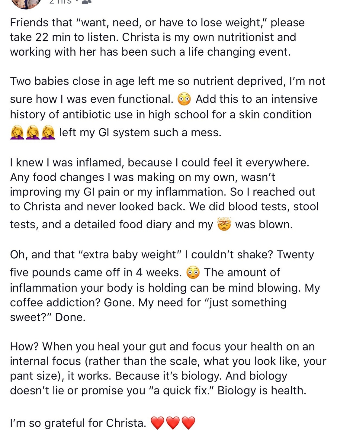Ashley was severely bloated and felt sluggish. Not only does she feel great about her body now, she is much more equipped in moving forward because she now understands what's going on.